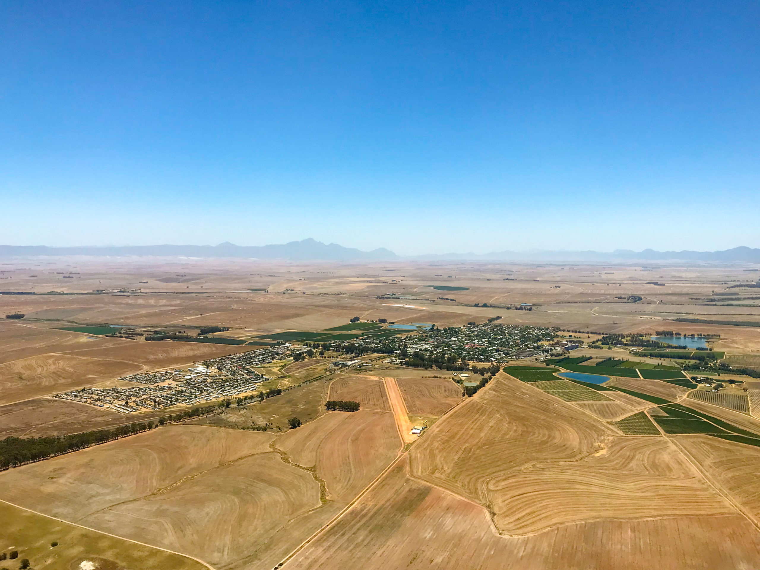 Le deuxième jour est le meilleur pour moi : alors que les compétiteurs de la Pré-PWC, qui a lieu à ce moment-là à Porterville, prévoient de ne pas trop s’éloigner du ridge et de finir leur vol à Citrusdal, nous nous élançons dans la plaine. Très vite nous nous séparons tous : je n’arrive à suivre ni Nico, ni Patrice qui volent trop vite pour moi, et je ne peux suivre Franck que des yeux, il semble faire tout son vol à 20 m/sol, avalant les kilomètres dans la fournaise ! Le vent n’est pas méchant, et je peux me concentrer sur la chasse aux thermiques ; je les trouve les uns après les autres au-dessus des villages, des points d’eau et des serres qui parsèment la plaine, c’est magique ! J’évite la zone sous-le-vent de Piketberg, et retourne boucler mon triangle non loin du décollage. Je vois Nico rentrer à fond les ballons sur ma droite et nous nous posons dans le même champ, entre deux dust devils (des tourbillons de poussière auxquels on donne le surnom amical de dusties ici).