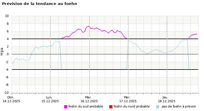 Mesure de la différence de pression entre le Nord et le Sud des Alpes ainsi que l’évolution de la pression pour les jours à venir. Cliquez sur l’image pour accéder au diagramme réel.
